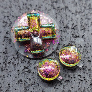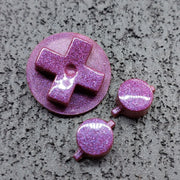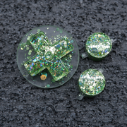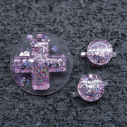 These Pocket Rocks, manufactured by Yesterday's Tech, are crystal clear resin buttons with multiple layers of hand-mixed pigment, glitter and holographic shimmers cast inside, specifically for use in Game Boy consoles.